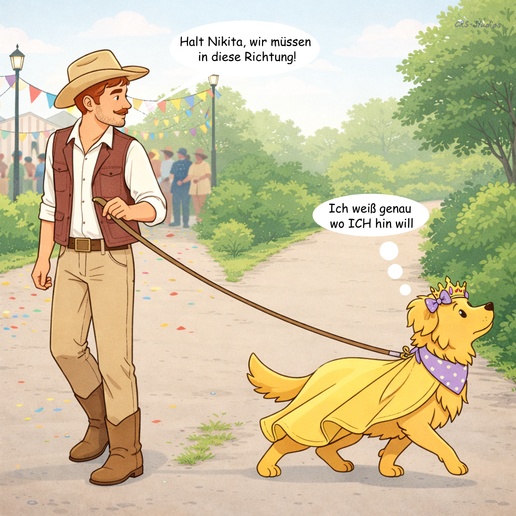 Am Faschingstag ist Niklas als Cowboy unterwegs, und Nikita trägt ein Prinzessinnenkostüm. Niklas will zum großen Menschen-Fasching – doch Nikita zieht in eine andere Richtung und setzt sich durch: ab zum Hundeplatz. Dort treffen sie auf andere Menschen, die denselben Plan hatten und am Ende ihren Hunden gefolgt sind. Während die Kostüme der Menschen geschniegelt bleiben, sind die Hundekostüme nach kurzer Zeit zerzaust und dreckig – weil den Hunden das Kostüm egal ist und Spielen wichtiger ist. Eine ältere Dame stellt lachend fest, dass es jedes Jahr genauso läuft. Auf dem Heimweg kommt ihnen schon die Straßenreinigung entgegen – das Menschen-Faschingstreiben ist vorbei. Zuhause liegen Niklas und Nikita zufrieden auf dem Sofa: Fasching geht auch ganz ruhig.