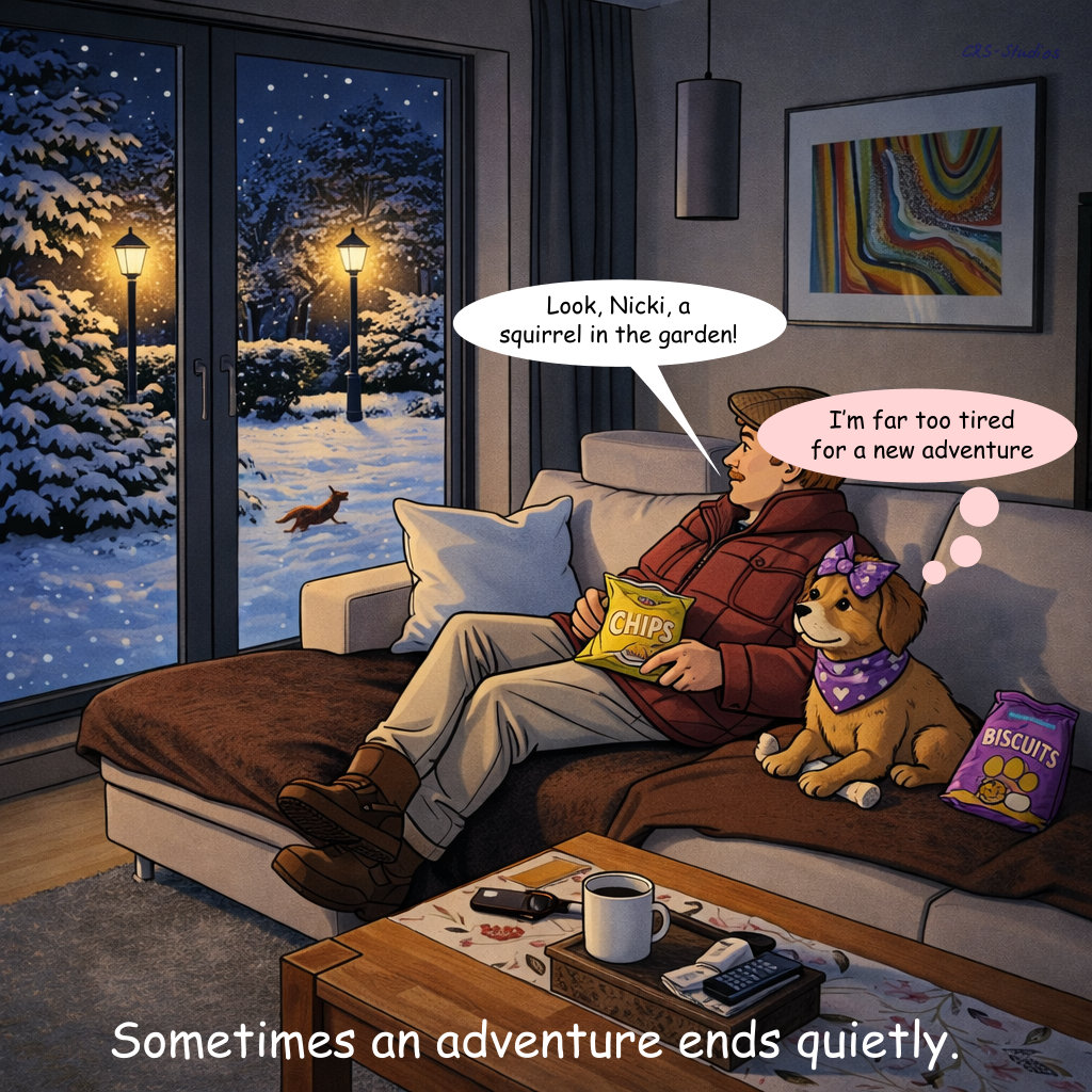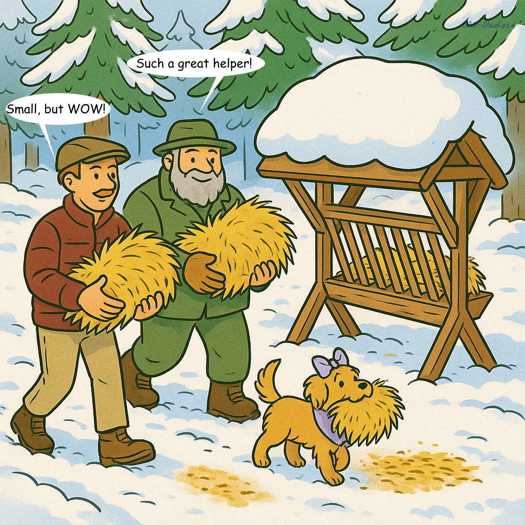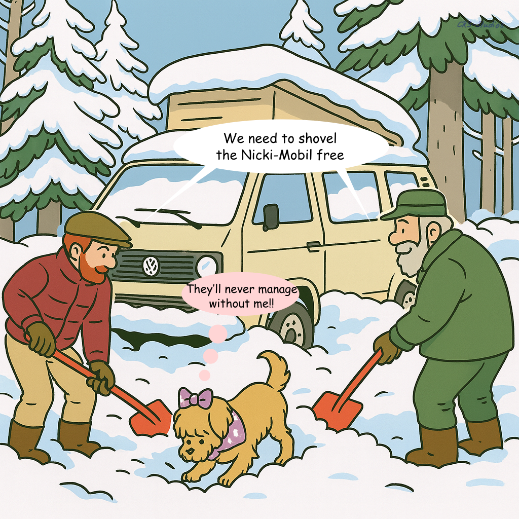 After the winter storm, Niklas and Nikita help set the wildlife feeding stations back in order. Along the way, Nikita loses her bow, but finds it again. The T3 is still stuck deep in the snow until a young farmer arrives with his tractor and tows the bus free. Later, they are invited home as a thank-you—and in the end, Niklas and Nikita sit peacefully on their sofa and realize: this view isn’t bad at all.